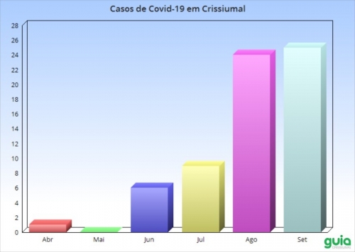 Foram por mês: 01 caso em abril, 06 em junho, 09 em julho, 24 em agosto e 25 em setembro, que agora já é o mês com o maior número de casos, mesmo com apenas oito dias.