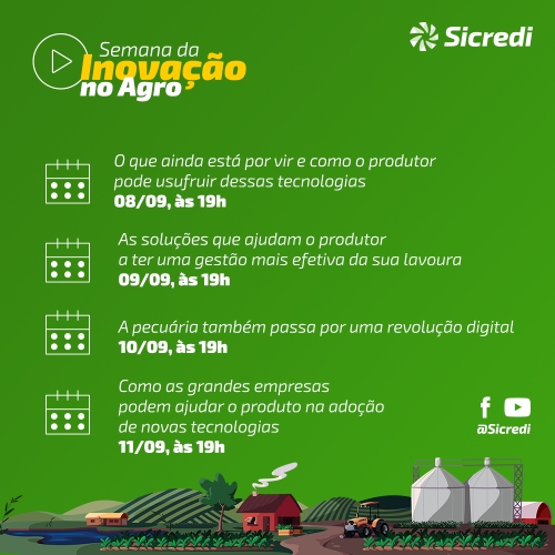 Os painéis que integram a “Semana de Inovação no Agro 2020” poderão ser assistidos ao vivo pelas redes sociais do Sicredi, YouTube (@sicredioficial) e Facebook (@sicredi), e pelo site do evento.