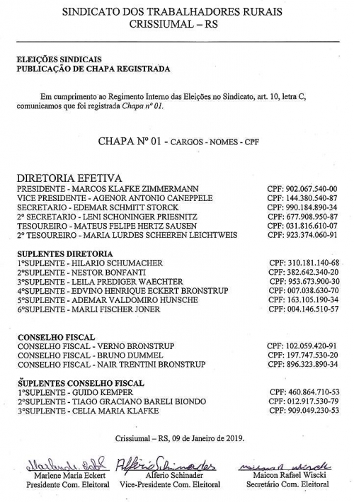 Apenas uma chapa se inscreveu no tempo hábil para as eleições da nova diretoria do Sindicato dos Trabalhadores Rurais de Crissiumal.