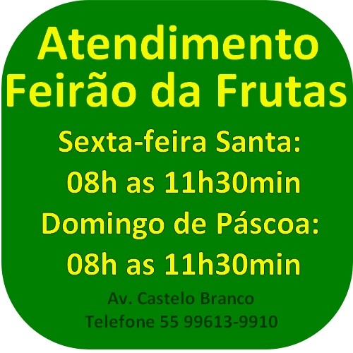 O Feirão das Frutas estará atendendo em horário diferencimento nesta sexta-feira Santa e domingo de Páscoa. O atendimento será somente pela parte da manhã das 08h as 11h30min.
