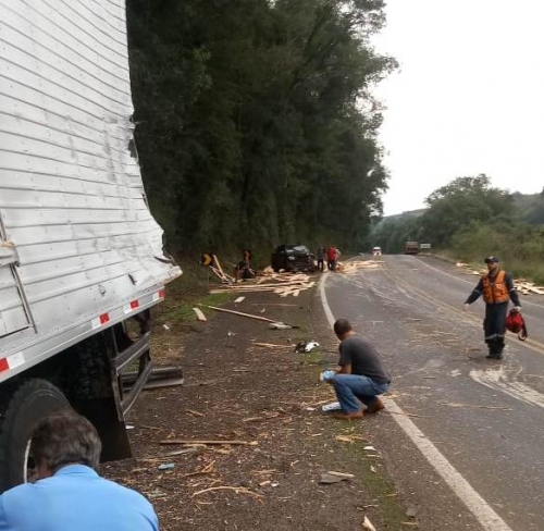 Uma carga de madeira de outro caminhão tombou em cima do caminhão crissiumalense, ocasionando um sério acidente, na BR 386, próximo ao local conhecido como Serrinha de Sarandi.