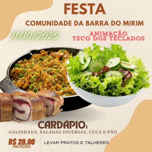 Ao meio dia a comunidade da Barra do Mirim estará realizando um almoço aos interessados, o cardápio será galinhada, saladas diversas, cuca e pão. Fichas ao valor de R$ 20,00 por pessoa. interessados devem adquirir fichas pelo whatsApp 5599146-4774.