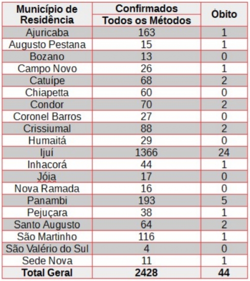 A região de abrangência da 17ª Coordenadoria Regional de Saúde chegou nessa sexta-feira (09) aos 2428 casos de coronavírus. São 44 óbitos na região, que tem como principal município Ijuí e onde Crissiumal está inserido.