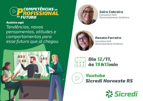 No dia 12 de novembro, próxima quinta-feira, a partir das 19h15min, no Youtube da Sicredi Noroeste RS, será transmitida o bate-papo ao vivo sobre as Competências do Profissional do Futuro, com as consultoras Zaira Cabreira e Renata Ferreira, da Seth Desenvolvimento Sistêmico.