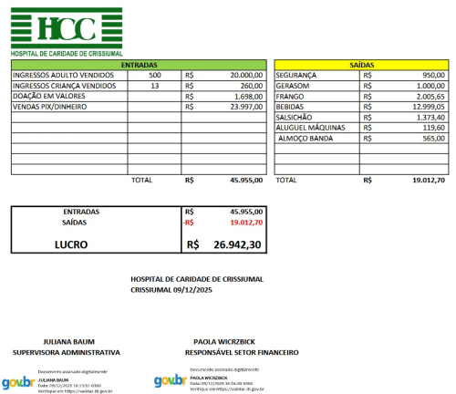 O Hospital de Caridade de Crissiumal divulgou na tarde dessa terça-feira (09/12) o lucro obtido com o baile da última quinta-feira (04) promovido em Vista Nova.