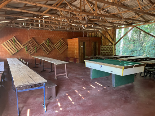 Além do salão de festas equipado com cadeiras, mesas, talheres, copos, churrasqueira, há vasto estacionamento, muita sombra, quiosque com churrasqueira externa, cancha de 48, mesa de sinuca e campo de futebol 7, entre outras atrações.