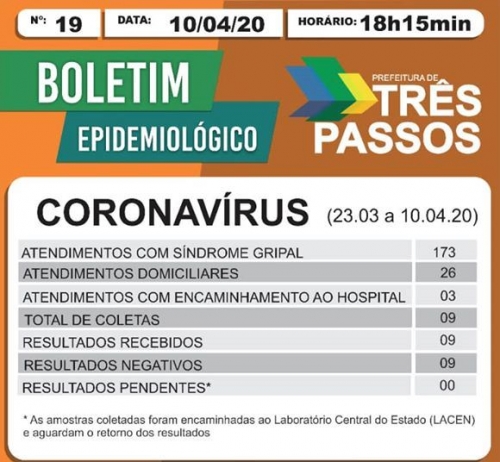 A Prefeitura Municipal de Três Passos divulgou no final da tarde deste sábado o Boletim Epidemiológico de nº 19.