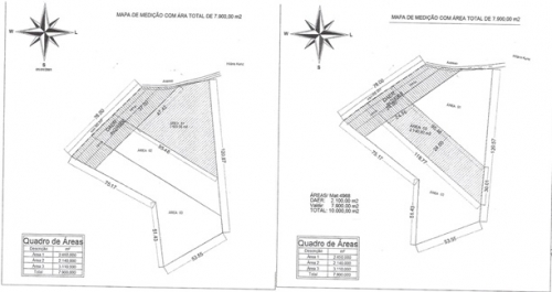 Um terreno de 2620,00 m² e o outro de 3400m², pelo valor de R$ 60.000,00 cada terreno.
