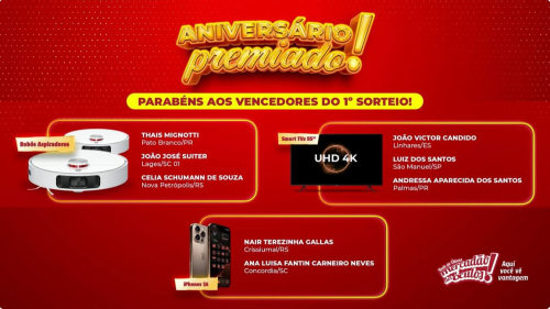 Hoje foi realizado o primeiro sorteio do nosso Aniversário Premiado, e a grande sortuda foi Nair Terezinha Gallas, nossa cliente de Tiradentes do Sul, que levou pra casa um iPhone 16 Pro Max!