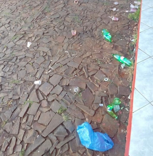 Outro local que amanheceu cheio de lixo espalhado mais uma vez nessa segunda-feira foi o pátio da prefeitura municipal, que estava cheio de garrafas, copos e restos de bebidas.