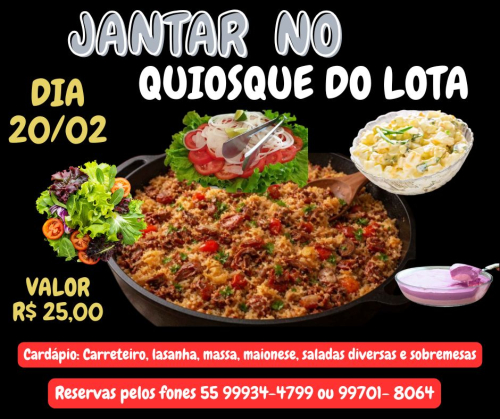 Cardápio: Carreteiro, lasanha, massas, maionese, saladas diversas e sobremesas.