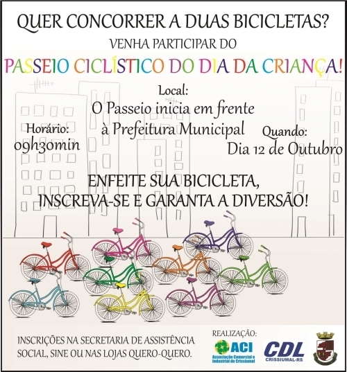 O Passeio Ciclístico inicia às 9:30 horas da manhã em frente a Prefeitura, seguindo pela Avenida Presidente Castelo Branco, até o Clube Crissiumal, passando pela Avenida Palmeira das Missões até a Praça 25 de Julho.