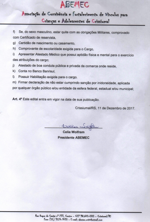 Editais - 11/12/2017 - Edital de Convocação dos primeiros colocados no cargo de Auxiliar Administrativo e Psicólogo da Abemec