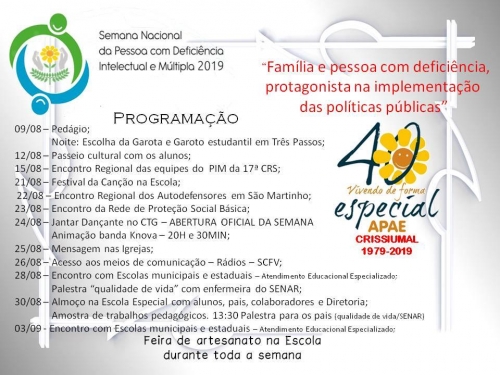 A Apae de Crissiumal divulgou nesta segunda-feira, dia 12 de Agosto a programação da Semana Nacional da Pessoa com Deficiência Intelectual e Múltipla 2019.