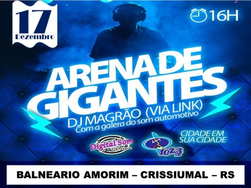 Também no domingo (17), às 16 horas, haverá no Balneário Amorim, o ARENA DE GIGANTES, com a presença do Dj Magrão, da Galera do Som Automotivo, Digital Som e Cidade em sua cidade.