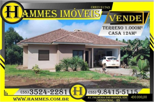 VENDE: LOTE RURAL: Chácara com 1.000m² com casa 124m² com laje e acabamento de alto padrão de frente para a RS-207, próximo do Salão Comunitário de Vista Alegre em Crissiumal – RS, R$ 430.000,00