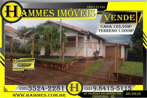 VENDE: LOTE URBANO: Terreno de 1.000m² com Casa Mista de 125,95m², excelente localização, próximo da Escola Ponche Verde, na rua Mauá em Crissiumal – RS, R$ 480.000,00