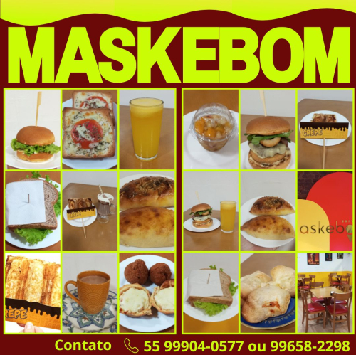 Maskebom oferece uma grande variedade em lanches, sucos naturais, chocolate quente e café. Alguns lanches que a Maskebom oferece: (Hamburguer, crepe, pastel assado, sanduíche, rosca, torrada, salada de frutas)