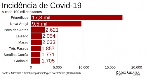 No monitoramento da incidência, os frigoríficos teriam 17,3 mil casos a cada 100 mil habitantes. Os municípios com o maior indicador do tipo no Rio Grande do Sul não chegam nem perto do que é registrado nas empresas de processamento de carnes. A pequena Nova Araçá é líder da classificação por incidência, com 9,5 mil casos a cada 100 mil habitantes. O número é extrapolado, uma vez que a população do município é reduzida (4,4 mil pessoas) e o número de casos de Covid-19 é elevado (454). Não por acaso, boa parte dos diagnósticos positivos de Nova Araçá veio de um frigorífico.