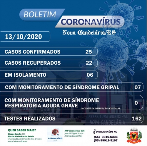 O Município de Nova Candelária registrou no boletim epidemiológico desta terça-feira, 13 de outubro, mais dois casos de Covid-19. Ambos os munícipes são integrantes do grupo de risco.