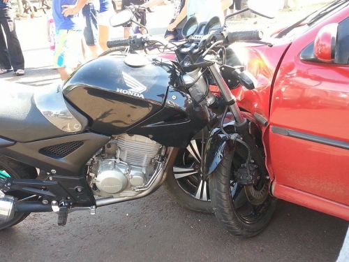 A motocicleta ficou em pé, com sua roda entrando no veículo.