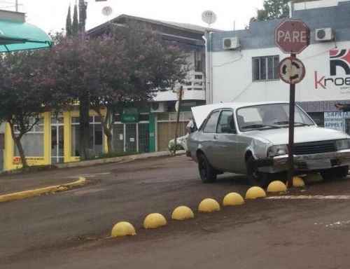 Um veículo GM Chevette colidiu contra uma placa de sinalização na rotatória das proximidades da Sonda Informática e Duarte Corretores de Imóveis, entre a Avenida Santa Rosa e Rua Guarita, na tarde deste domingo (14), por volta das 18h30min.