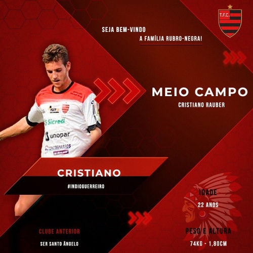 O outro reforço é o meia / volante Cristiano Rauber Oliveira (foto abaixo) que é natural de São Paulo das Missões, possui 22 anos e defendeu o Elite de Santo Ângelo, União Frederiquense, Santo Ângelo, TAC, Sampaio Correa, SER Cruz Alta e SER Santo Ângelo. No ano passado ele defendeu o Tupi em 12 jogos, marcando um belo gol na importante vitória diante do São Borja na Fronteira Oeste.