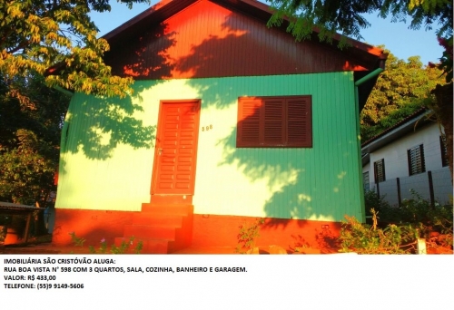 Imobiliária São Cristóvão aluga casa na Rua Boa Vista, com 3 quartos, sala, cozinha, banheiro e garagem. R$ 433,00