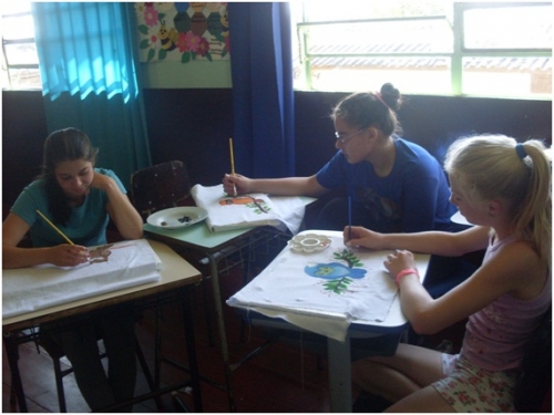 Depois de terminadas as pinturas, os alunos levam para casa para realizar o acabamento nos panos e fazer crochê na escola em outra oficina.