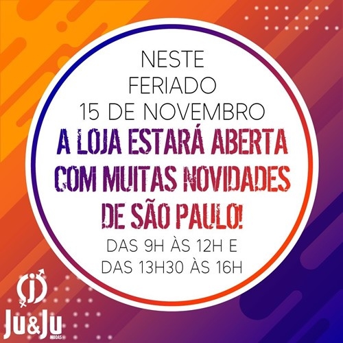 Aproveite o feriado do dia 15 de novembro, sexta-feira e visite a JU&JU Modas..