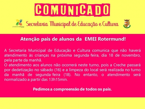 Atenção pais de alunos que frequentam a EMEI Rotermund, a Secretaria Municipal de Educação e Cultura comunica que não haverá atendimento às crianças na próxima segunda-feira, dia 18 de novembro, pela parte da manhã.