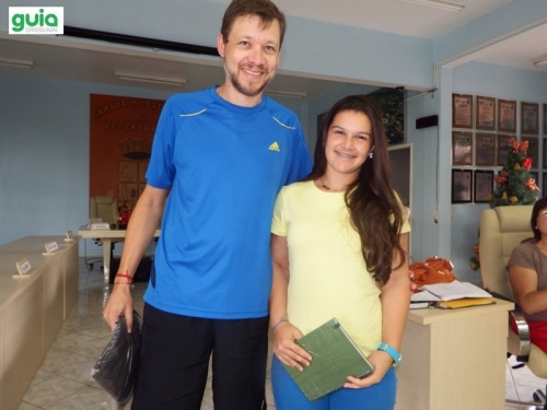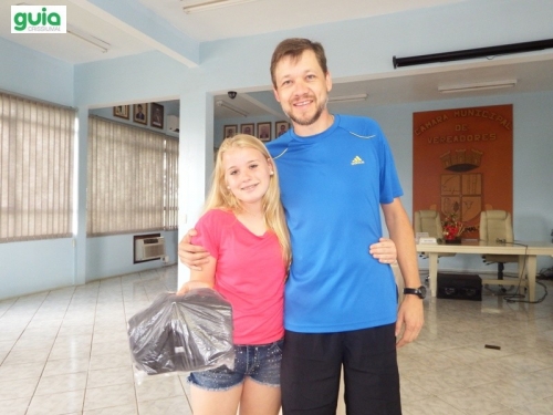 Nas fotos acima, as alunas da Escola Riachuelo de Vila Planalto Eduarda Carvalho e Francini Favaretto, que receberam das mãos do Coordenador do Projeto, professor Joel Rex, um prêmio patrocinado pelo Sicredi, por ser as duas melhores colocadas entre todos os estudantes do Município.