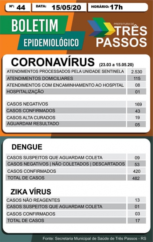 Três Passos registrou quatro novos casos confirmados de coronavírus nessa sexta-feira, dia 15 de maio de 2020.