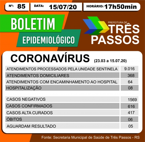 Três Passos chegou aos 616 casos, com 417 curados e 06 óbitos (foto do topo). Humaitá teve quatro novos casos, chegando a 15 no total, com 11 recuperados.