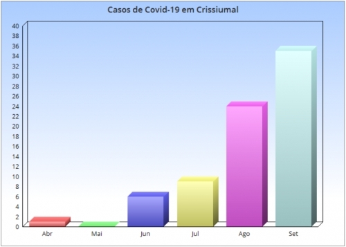 Foram por mês: 01 caso em abril, 06 em junho, 09 em julho, 24 em agosto e 35 em setembro, que é o mês com o maior número de casos.