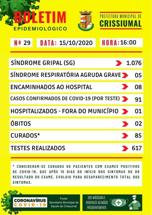Crissiumal possui agora um total de 91 casos de coronavírus. Novos casos foram registrados nessa quinta-feira (15) no Boletim Municipal divulgado no final da tarde.