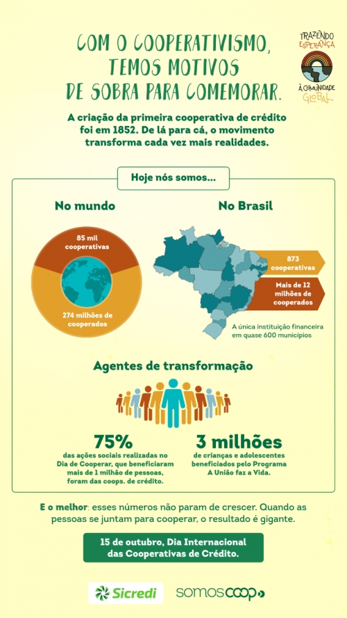 A capacidade do cooperativismo de crédito gerar transformações positivas na sociedade foi o tema ressaltado pelo Sicredi nas ações de comemoração ao Dia Internacional das Cooperativas de Crédito, celebrado este ano no dia 15 de outubro, com o tema “Trazendo Esperança à Comunidade Global”. Seja por meio do apoio ao empreendedorismo ou ações que contribuem com o desenvolvimento de economias locais, gerando inclusão e transformação social, o cooperativismo de crédito vem se mostrando, há mais de 100 anos, um instrumento para proporcionar resultados que vão além dos financeiros, levando benefícios diretos para as pessoas e as comunidades, no Brasil e no mundo.