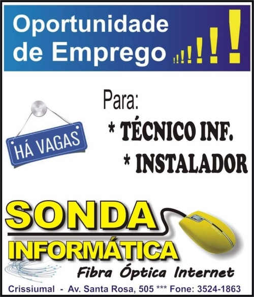 A Sonda Informática de Crissiumal está contratando um técnico de informática e um instalador.