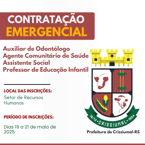 A Prefeitura de Crissiumal divulgou nessa sexta-feira a publicação de editais para a contratação emergencial de 04 cargos: