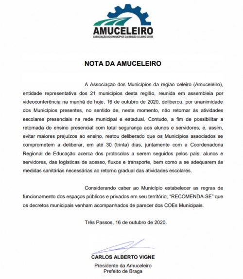 A Associação dos Municípios da região celeiro (Amuceleiro), entidade representativa dos 21 municípios da região Celeiro, reunida em assembleia por videoconferência na manhã dessa sexta-feira, 16 de outubro de 2020, deliberou, por unanimidade dos Municípios presentes, no sentido de, neste momento, não retornar às atividades escolares presenciais na rede municipal e estadual.