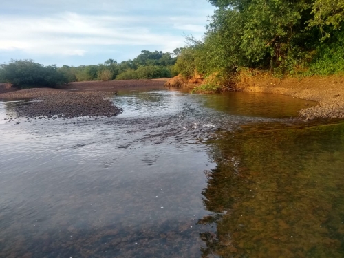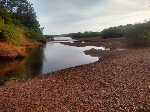 O curso de água está tão baixo que já afloram os montes de areia nos trechos mais rasos.