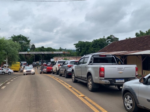 Veículos argentinos estão retidos no pátio da antiga aduana e brasileiros formam longa fila na principal rua do bairro. Segundo os manifestantes, a passagem está sendo liberada a cada 1h40 minutos.