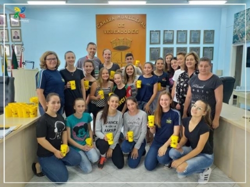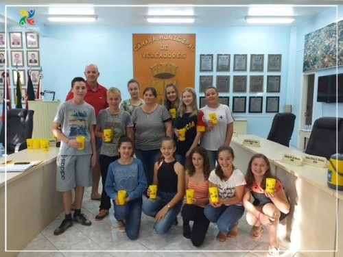 Durante a reunião os alunos foram agraciados com garrafas isotérmicas e copos personalizados do Projeto.