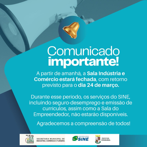 A partir de amanhã, a Sala Indústria e Comércio estará fechada, com retorno previsto para o dia 24 de março.