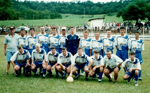 Aos fundos a primeira sede do Esporte Clube 1º de Maio, com jogadores veteranos e fundadores