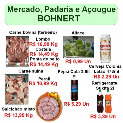 Mercado, Padaria e Açougue Bohnert, Rua Horizontina, telefone 55 3524-1055 ou 98474-1055.