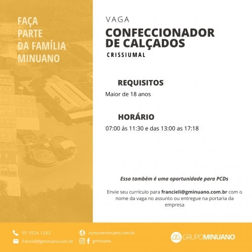 O Grupo Minuano (Malu Calçados) oferece vagas de trabalho para confeccionador de calçados em Crissiumal. As vagas são para ambos os sexos. Os interessados deverão ter mais de 18 anos. O horário de trabalho da empresa é de segunda a sexta das 07h00min às 11h30min e das 13h00min às 17h18min. Os currículos devem ser enviados para o contato francieli@gminuano.com.br ou ainda entregues na portaria da empresa. Essa também é uma oportunidade para PCDs.