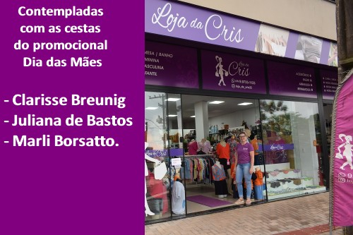 As contempladas com as cestas foram: Clarisse Breunig, Juliana de Bastos e Marli Borsatto. As mesmas podem passar na loja e retirar o prêmio.
