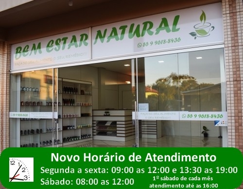A Bem Estar Natural, loja de produtos naturais estará a partir dessa terça-feira, dia 20 de outubro, atendendo em novo horário. O atendimento será de segunda a sexta das 09h00min as 12h00min e das 13h30min as 19h00min e aos sábados o atendimento será das 08h00min as 12h00min. No primeiro sábado de cada mês terá atendimento também pela parte da tarde, até as 16h00min.