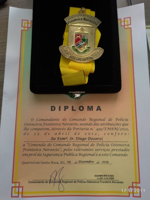 Nesta semana o Comandante do Pelotão da cidade de Crissiumal Tenente Cassio Horazy fez a entrega da Comenda do CRPO/FNo ao Juiz de Direito Excelentíssimo Senhor Diego Dezorzi da Comarca da cidade.